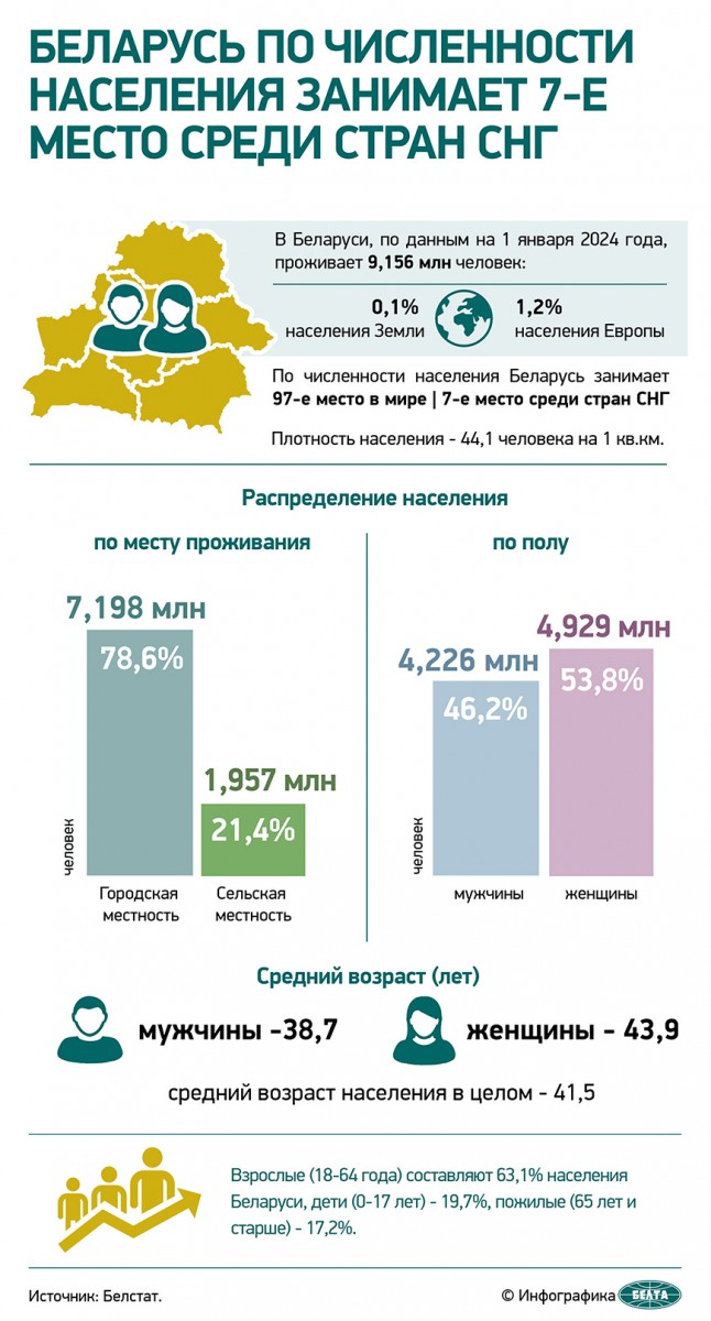 В Беларуси, по данным на 1 января 2024 года, проживает 9,156 млн человек: