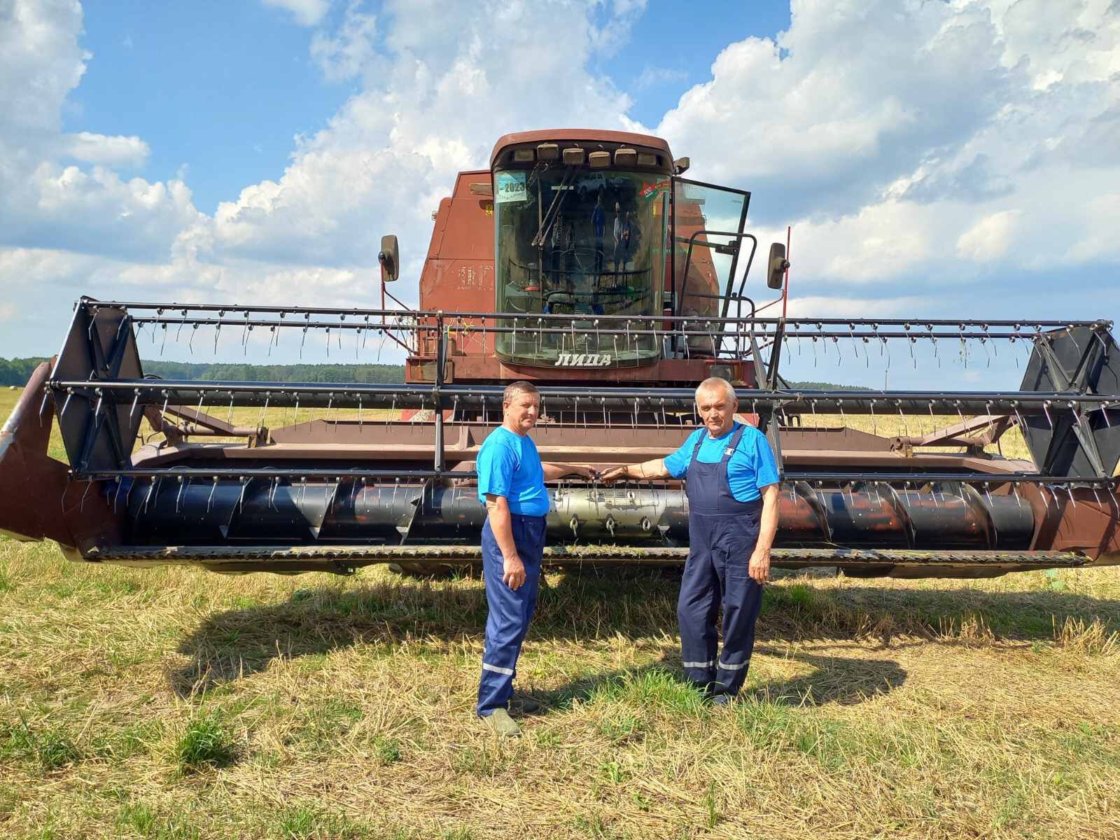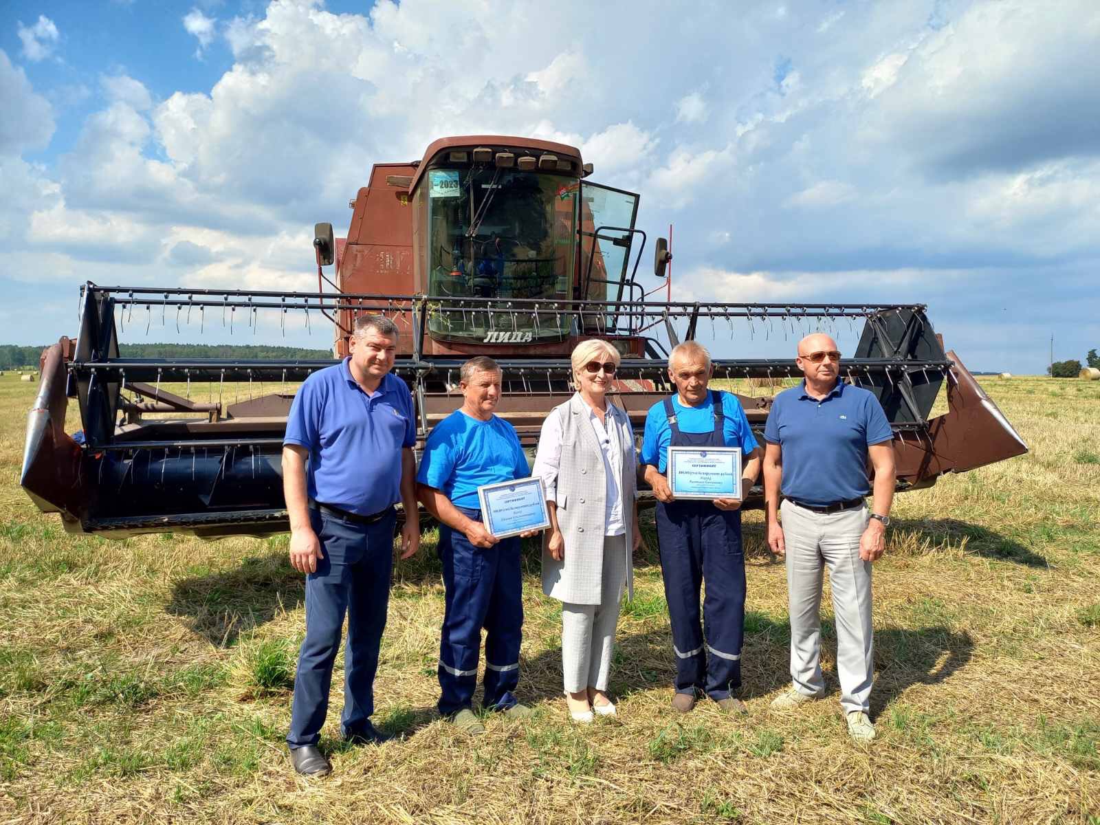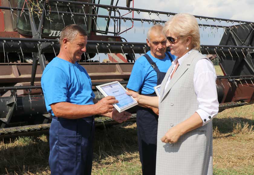 Вместе с профсоюзным лидером аграриев Дятловского района Владимиром Козаком и главным агрономом КСУП "Хвиневичи" Александром Кугейко Тамара Иосифовна чествовала старшего комбайнера Анатолия Марука и комбайнера Николая Жинко. Они стали лучшими в подгруппе комбайнов "Лида-1300".
