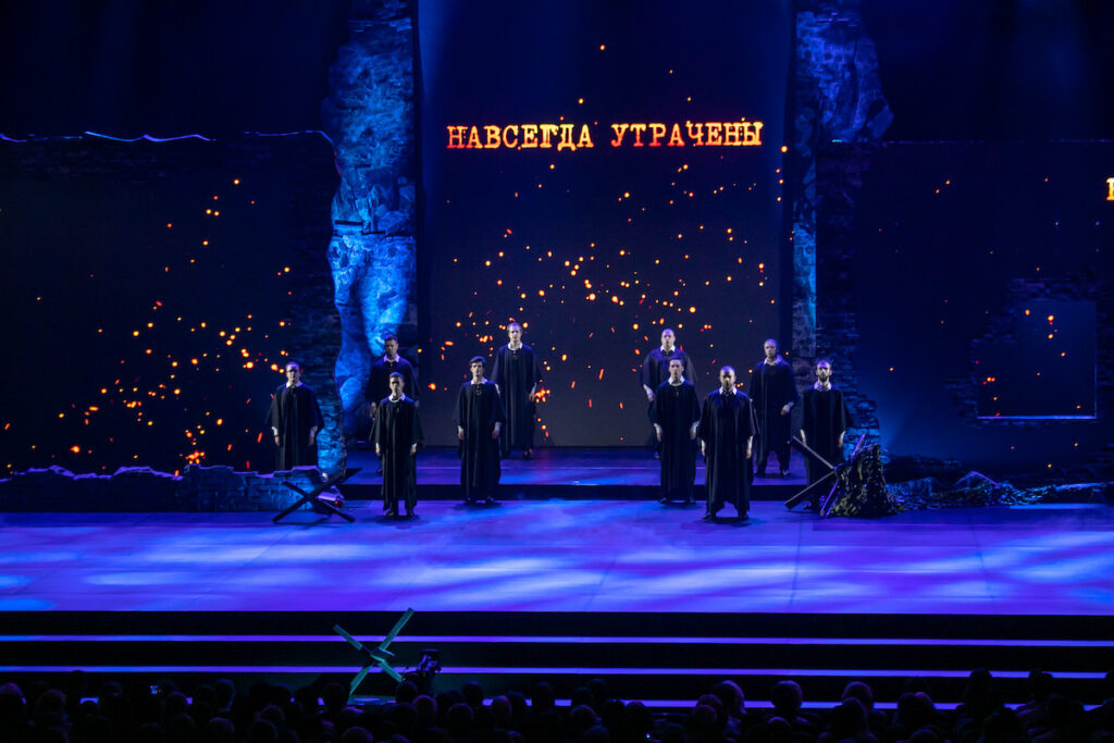 Со сцены звучат знаковые композиции о войне, сменяются кадры кинохроники, запечатлевшие, как горели белорусские деревни, как враг безжалостно топтал своим грязным сапогом нашу землю. И мурашки по коже.