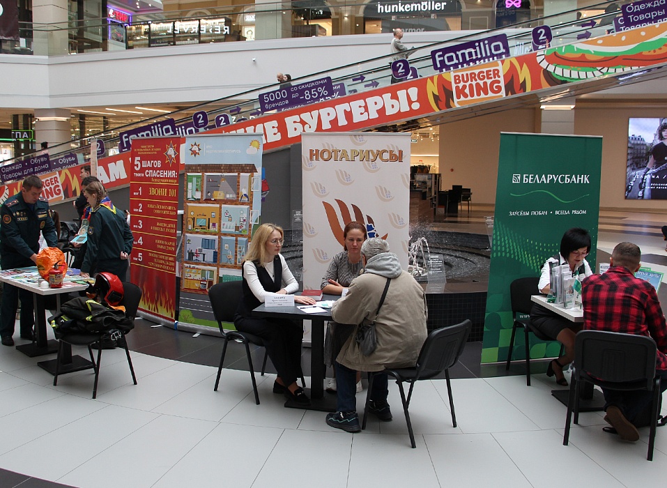 1 октября, в День пожилого человека, в торгово-развлекательном комплексе «ТRINITI» г. Гродно для оказания безвозмездной правовой, консультативной и профилактической помощи собрались нотариусы, представители УВД Гродненского облисполкома, МЧС, Гроднооблгаз, Центра социального обслуживания населения, скорой медицинской помощи и Беларусбанка.