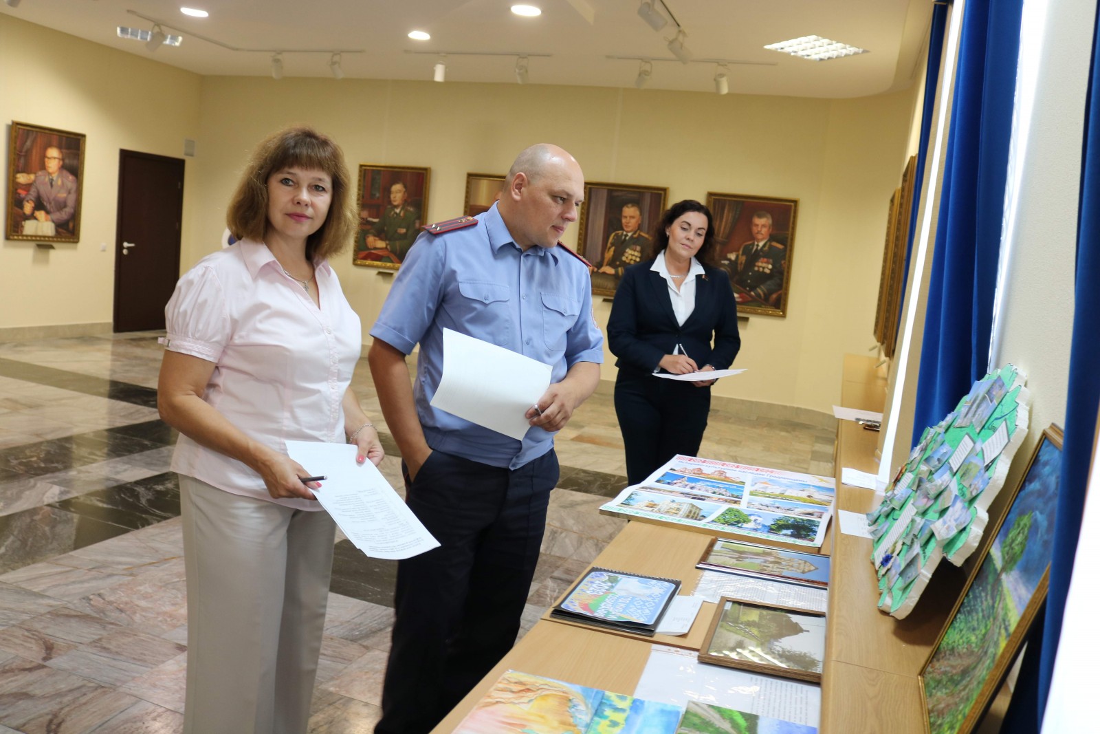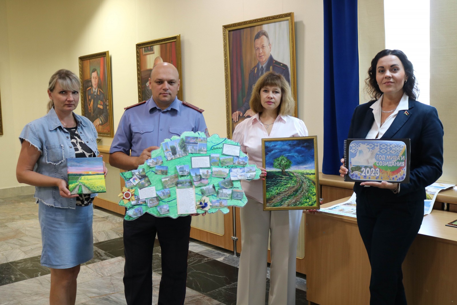 Ольга Добрилко из Гродненского РОВД подготовила стенгазету «Единство». На вырезанной из пенопласта карте нашей страны Ольга разместила главные архитектурные сооружения и уникальные места синеокой Родины: Беловежскую пущу, Дворец Пусловских, Национальную библиотеку, реку Нарочь, мемориальный комплекс «Хатынь»...