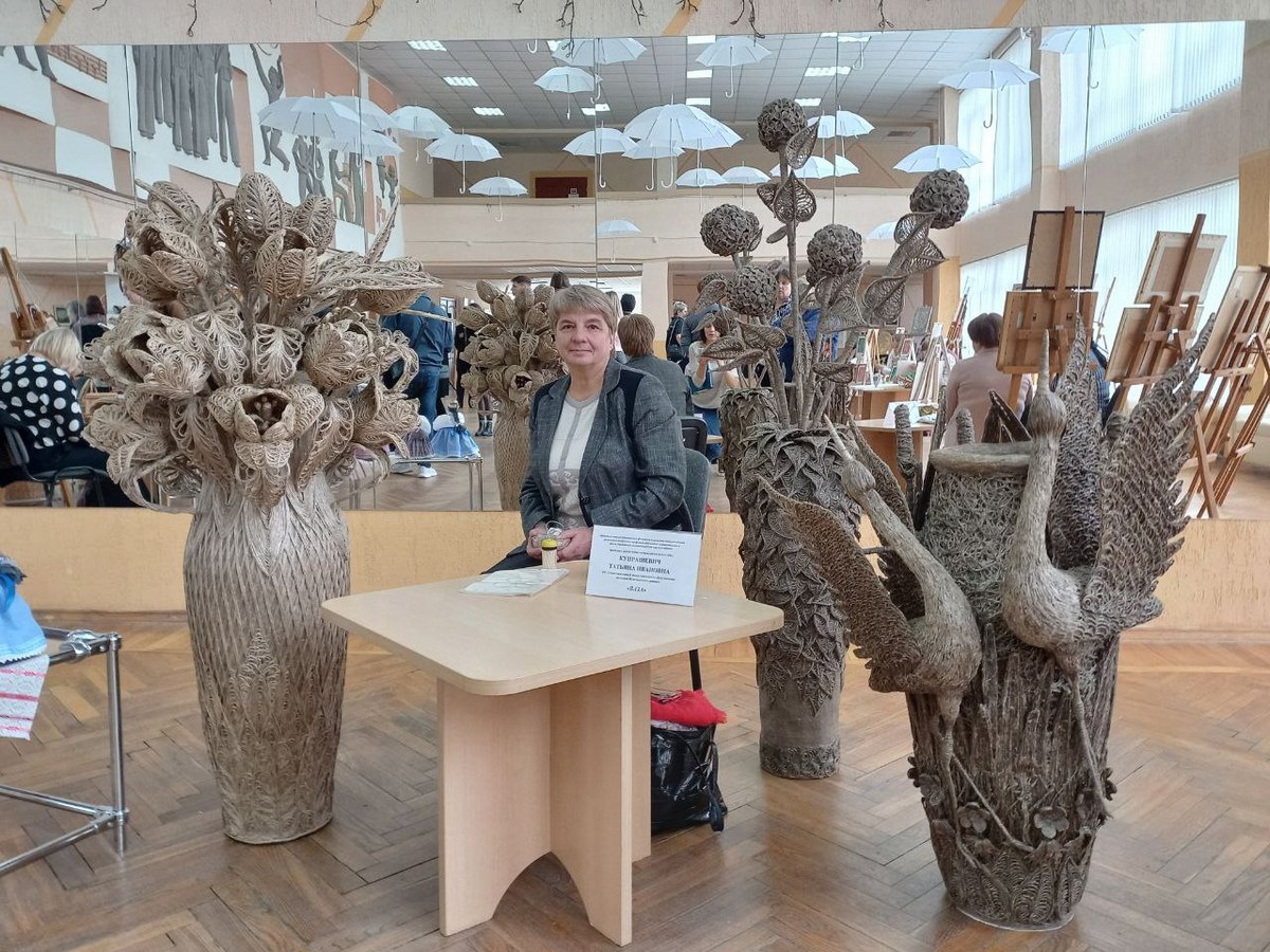 Например, Татьяна Купрашевич, работник ТЦСОН Волковысского района, привезла на выставку необычные вазы, выполненные из ротанговой и льняной нити, поражающие своей красотой. На одно изделие высотой около метра у мастерицы уходит порядка 100 клубков нитей, а по времени она затрачивает от одного до полутора лет.