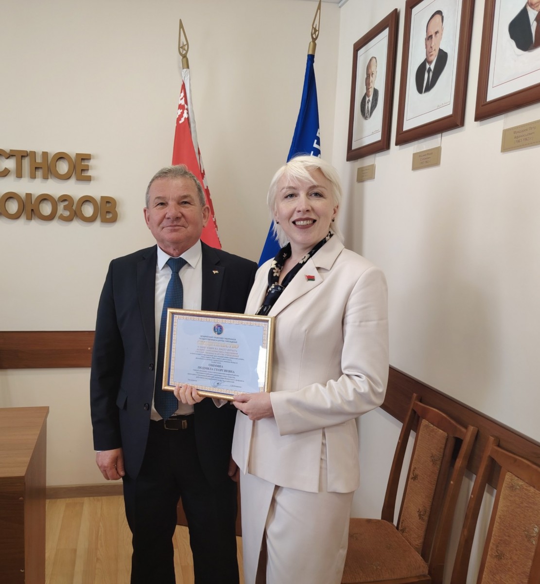 В завершение своего выступления Сергей Потапенко вручил свидетельство о занесении на доску почета Белорусского Профсоюза работников государственных и других учреждений за многолетний и добросовестный труд, высокий профессиональный уровень, плодотворную общественную деятельность, личный вклад в развитие профсоюзного движения Беларуси Ошмяна Людмиле Георгиевне, главному специалисту отдела организационно-кадровой работы Гродненского районного исполнительного комитета, председателю Гродненской районной организации Белорусского Профсоюза работников госучреждений.