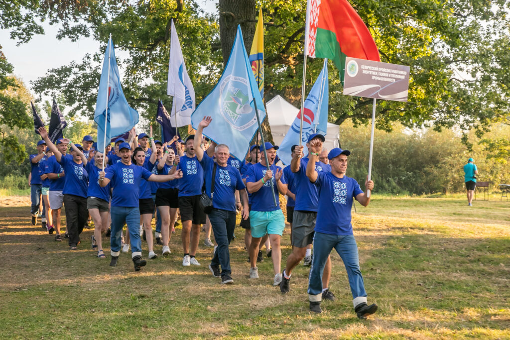 Открытие Х Республиканского турслета профсоюзов на призы ФПБ получилось очень торжественным и праздничным. Команды под флагами отраслевых профсоюзов прошлись почетным кругом и выстроились у сцены, прозвучали гимны – государственный и профсоюзов.