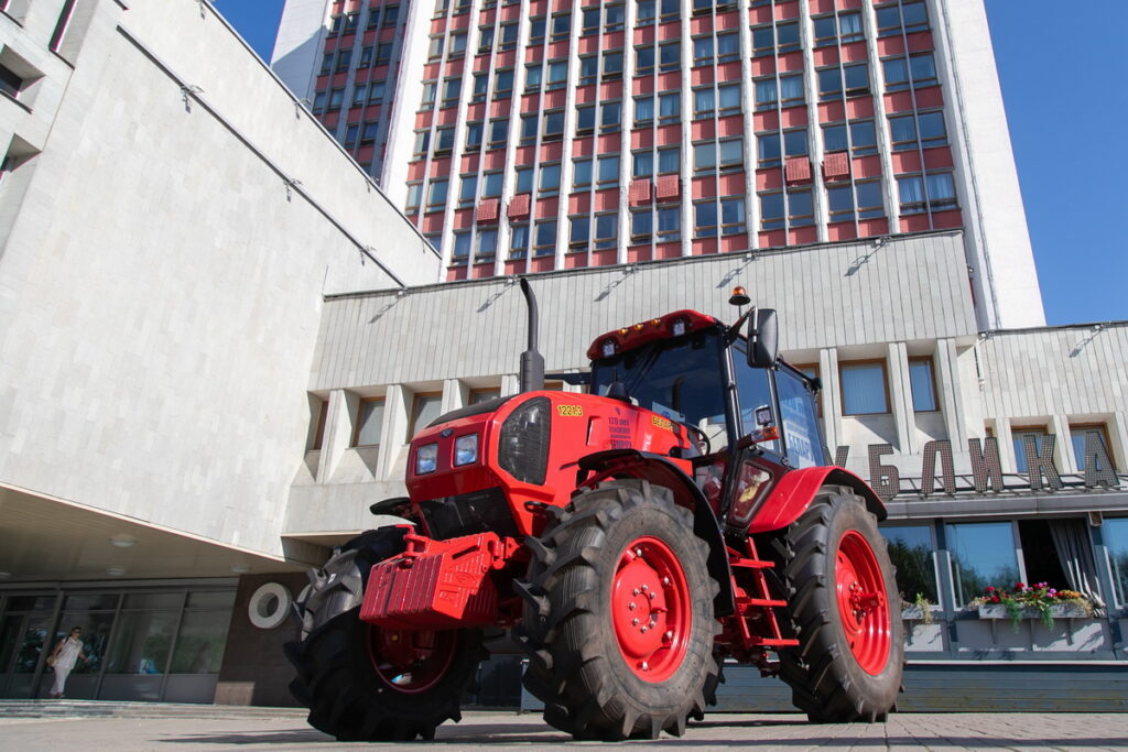 Сегодня напротив главного входа в штаб-квартиру ФПБ в Минске появился трактор BELARUS с юбилейной надписью на корпусе «120 лет профсоюзному движению Беларуси».