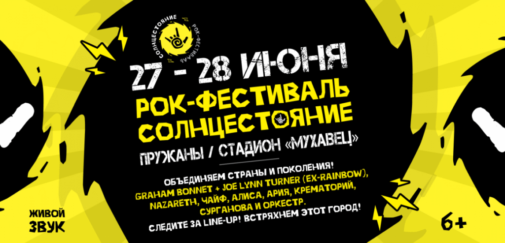 Город Пружаны с 27 по 28 июня превратится в эпицентр рок-культуры Беларуси. Фестиваль «СОЛНЦЕСТОЯНИЕ» соберет на стадионе «Мухавец» группы «Чайф», «Алиса», «Крематорий», «Ария», «Сурганова и оркестр», а также Nazareth и другие.