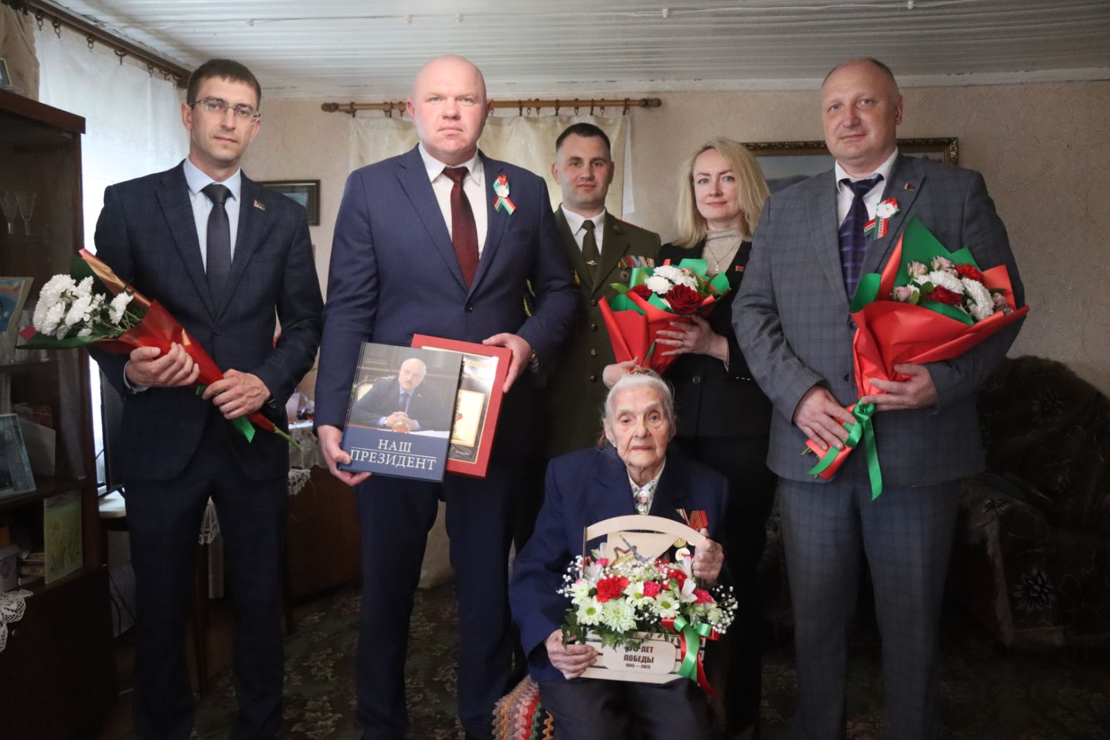 Андрей Гордей, председатель Кореличского райисполкома высказал ветерану войны искренние поздравления с приближающимся праздником Победы, вручил материальную помощь, а также цветы и подарок от губернатора Гродненской области Юрия Караева, в том числе и книгу «Наш Президент». Самым примечательным подарком стало письмо от Президента Республики Беларусь в виде фронтового треугольника со словами глубокой благодарности за завоеванный мир. Пожелания крепкого здоровья и долголетия прозвучали для Надежды Петровны от остальных гостей, которые также приготовили для нее цветы, памятные подарки и передали продуктовые наборы.