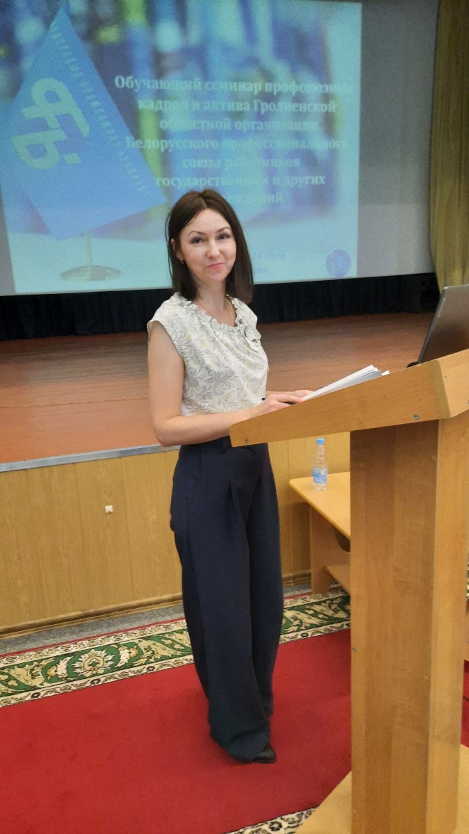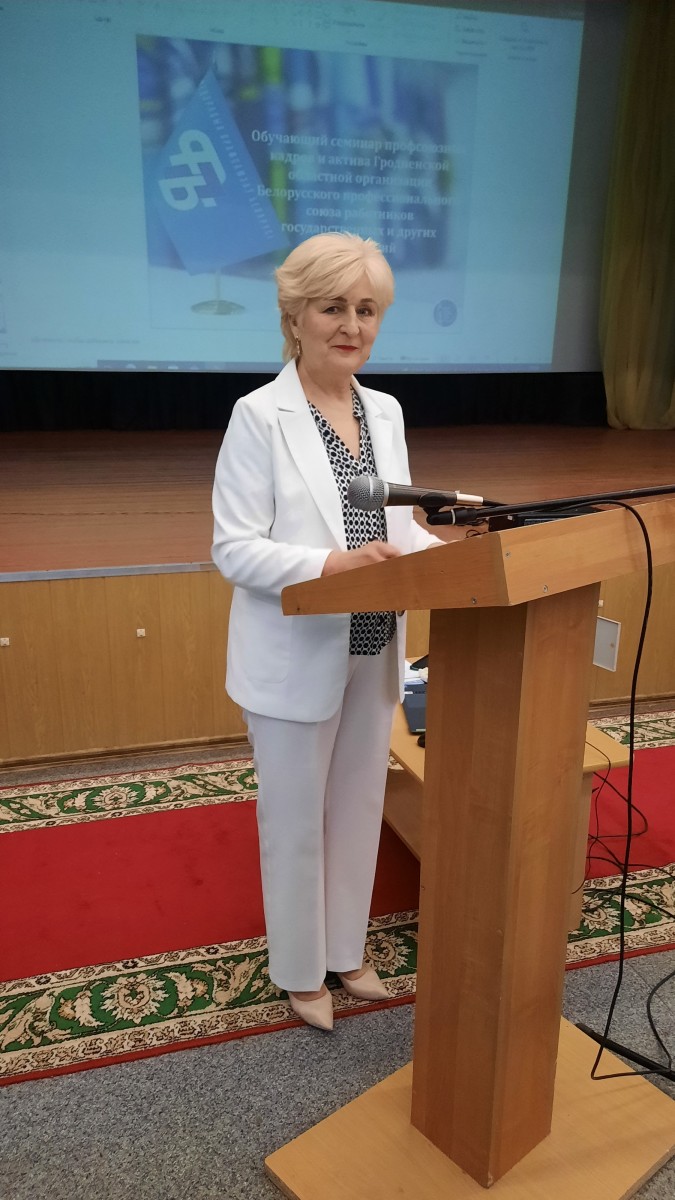 С приветственным словом выступила Председатель Гродненской областной организации Белорусского профсоюза работников государственных и других учреждений Тамара Стасевич. Темой семинара обозначены актуальные вопросы деятельности профсоюзных организаций Гродненского обкома.