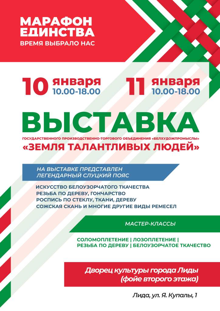 Выставка народных ремесел «Земля талантливых людей» состоится в Лиде во время «Марафона единства». Ознакомиться с уникальными экспонатами можно будет во Дворце культуры города Лиды 10 и 11 января.