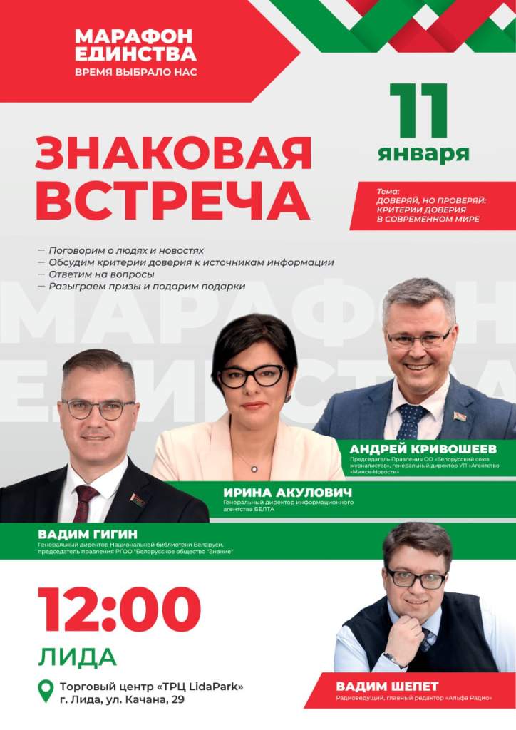 Уже в эту субботу, 11 января, в рамках масштабной республиканской общественно-культурной акции «Марафон единства» пройдет «ЗНАКОВАЯ ВСТРЕЧА», пишет lidanewsby.