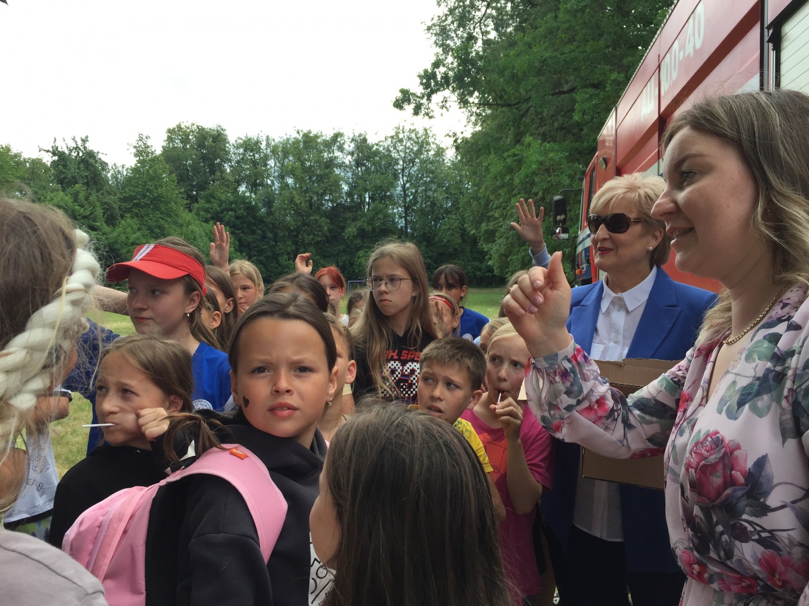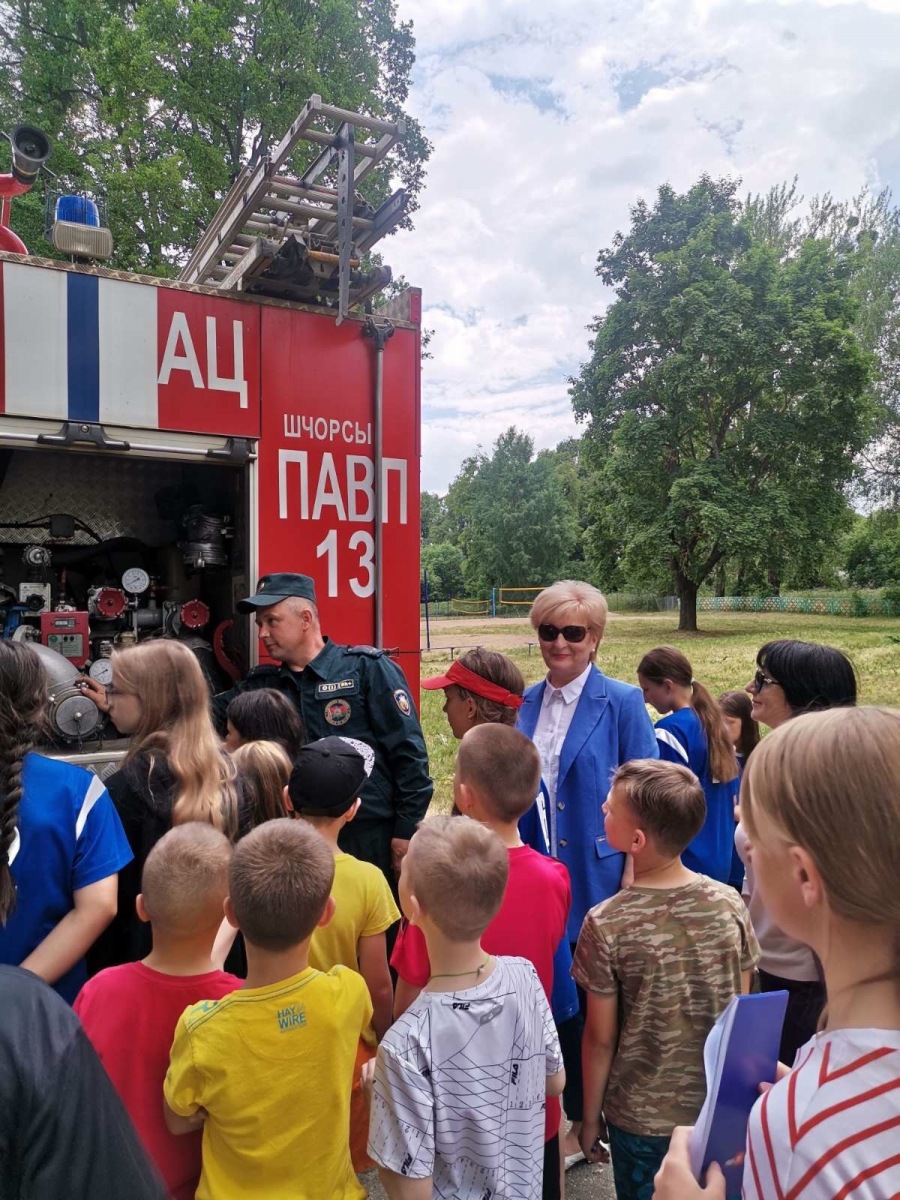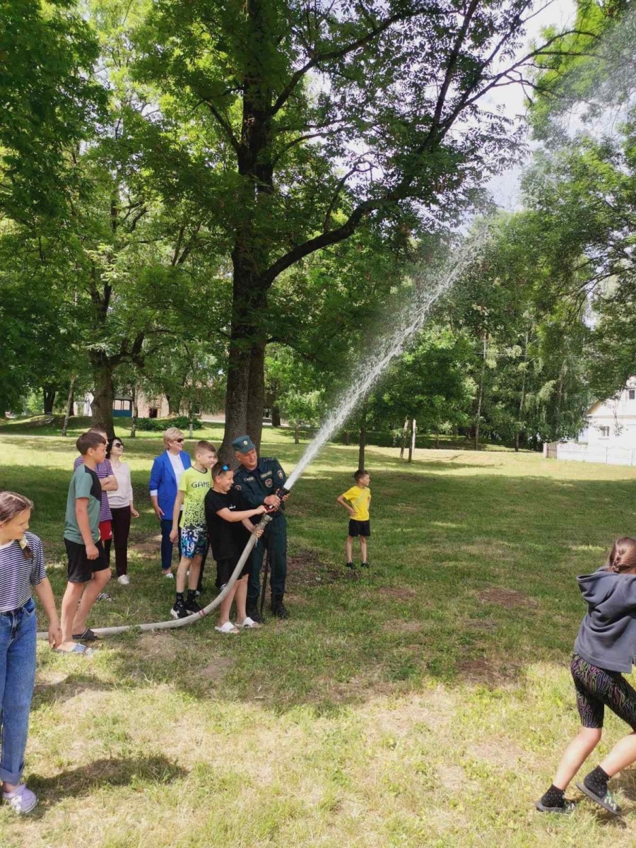 Ребят ждал ещё сюрприз, который подготовили сотрудники Новогрудского районного подразделения МЧС. Им продемонстрировали пожарную машину, одежду спасателей, ознакомили с техникой, которая имеется на вооружении. Ребята смогли себя почувствовать настоящими огнеборцами, подать воду из ствола и пожарного шланга, посидеть за рулём пожарной машины, включить сирену и передать приветы друзьям по громкоговорителю.