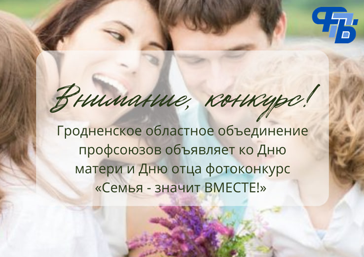 Дорогие друзья! Совсем скоро мы будем отмечать два замечательных праздника — День матери и День отца. В преддверии этих светлых дат Гродненское областное объединение профсоюзов проводит фотоконкурс «Семья — значит ВМЕСТЕ!».