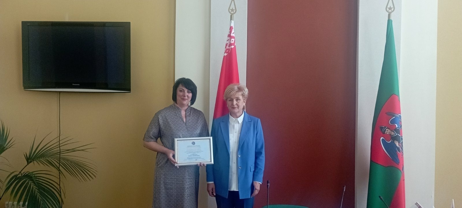 Профсоюзный лидер вручила председателю Новогрудской районной организации профсоюза работников государственных и других учреждений Ирине Бачинской свидетельство о занесении на Доску Почета Белорусского профсоюза работников государственных и других учреждений за активное участие в профсоюзном движении.